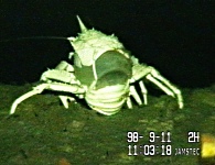 | ↑ソコボウズ | ↑左、隠れ蓑を背負ったカニの一種、ホモラ科の仲間 | ↑海底に半身を埋めたツバサシロウリガイと巻貝 | |||