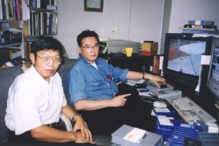 東京シネマ新社で「校長先生」を編集中のラウレンティー・ソンと岡田一男